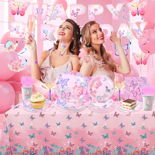Dreamtop 114 Pcs Butterfly Birthday Party Supplies, Butterfly Girls Birthday Party Decorations-Serves 20 with Disposable Butterfly Plates Napkin Invitations Forks Banner Hanging and Tablecloth