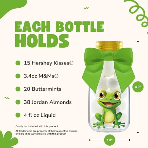 - INCLUDES: 12 Plastic Bottles, Gold Caps, Ribbons, Frog Stickers, and Thank You Stickers. Each bottle measures 4.00 x 1.80 inches and holds 4 ounces, perfect for creating frog party decorations