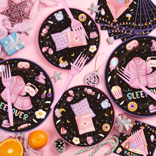 - 96PCS Serve 24 Guests: Pajama birthday decorations disposable tableware set includes 24 dinner plates (9 inches), 24 dessert plates (7 inches), 24 napkins, and 24 forks. Perfect for girls sleepover party supplies