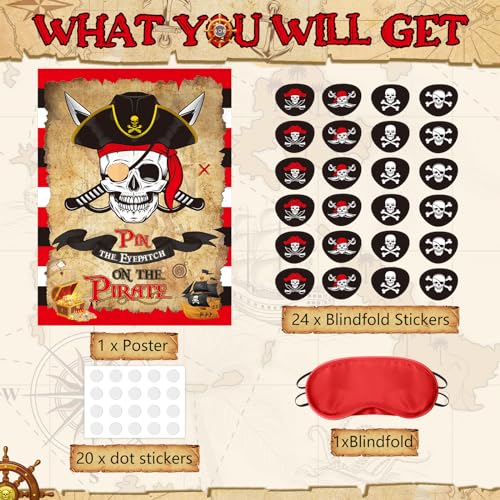- Pirate Party Games: our pirate birthday party games include a large 21 x 28 inch pirate poster, 24 eye patch stickers, 1 pink eye mask, 1 sheet glue points to allow multiple people to play pin games together at a party; Ideal for pirate birthday parties and other parties