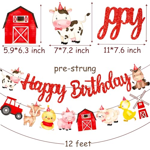 - 【Farm birthday party banner】The package includes 1pcs red glitter happy birthday sign and 1pcs farm theme cutout banner, a total of 2pcs wonderful banners. A variety of farm party elements cutouts make your party more delightful and fun.