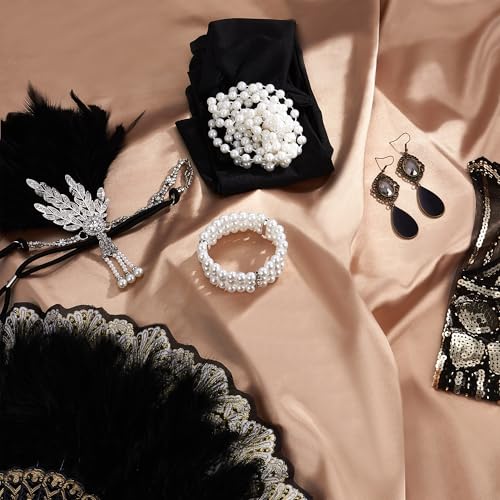- 1920s Accessories for Women: The 1920s women accessories set includes 1 pc flapper headband, 1 pc faux pearl necklace, 1 pair 1920s earrings, 1 pc artificial pearl bracelet, 1 pair gloves, 1 pc women dress shawl and 1 pcs lace fan