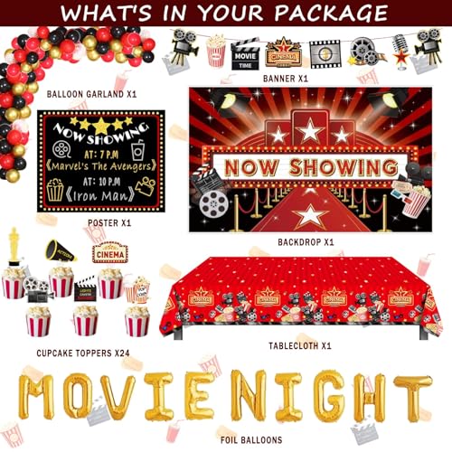 • MOVIE NIGHT PARTY SUPPLIES DECORATIONS INCLUDES – 77 x 12’’ latex balloons | 24 x 5’’ latex balloons | 1 x 16’’ ‘MOVIE NIGHT’ foil balloons | 1 x backdrop | 1 x banner | 1 x tablecloth | 24 x cupcake toppers | 1 x poster | 2 x markers | poster stand | balloon strip | ribbons | glue dots