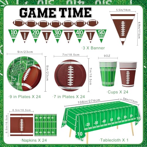 - 【Football Party Decorations】: Get ready to score big with our football themed birthday party supplies set! This all-inclusive package includes a paper banner set (combining yard numbers of the field and football patterns), 24 x 9-inch football plates, 24 x 7-inch football plates, 24 football napkins, and 24 x 9oz football cups, each available in two different styles of 12 each. Plus, we've got you covered with a 54" x 108" football tablecloth to complete the look.