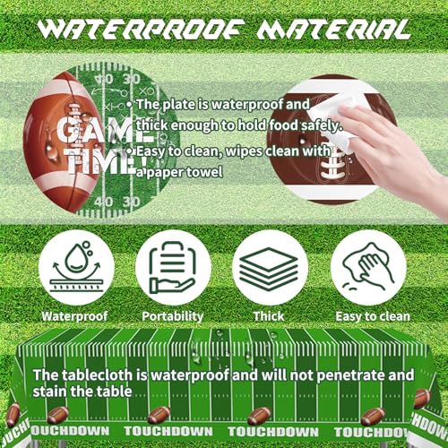 - Football Party Supplies Set Package includes:24 x 9 inch paper dinner plate, 24 x 7 inch paper dessert plates, 24 paper cups (in 2 designs),24 x 6.5 inch napkins (mix 2 designs),2pcs 54" x 108" disposable plastic tablecloth(in 2 styles),24 pcs forks,12 pcs mini football foam fingers,2 football foil balloons and 1 set banner. Get everything you need for a memorable football party in one set,creating an immersive game-day atmosphere