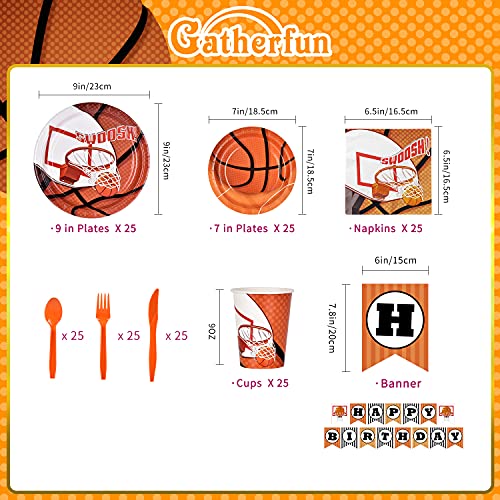 - BASKETABLL PARTY SUPPLIES INCLUDING: 25*dinner paper plates (9 inches), 25*dessert paper plates (7inches), 25* knives, 25*forks, 25*spoons, 25*napkins, 25*paper cups (9oz), 10*black balloons, 10*orange balloons, 1*banner (HAPPY BIRTHDAY)