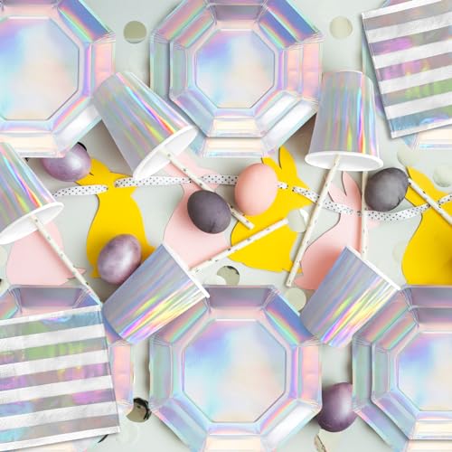 Iridescent Party Supplies – Disposable Paper Plates, Cups and Napkins, Ideal for Birthday, Mermaid Themed Events & Birthday or Wedding Party Decoration – Serves 16