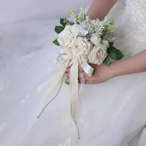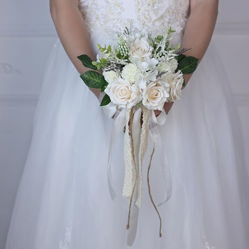 - 【Exquisite design】:This bridal bouquet contains champagne roses, white hydrangeas, lavenders, gypsophila, rose leaves, frosty green eucalyptus leaves, ribbons and jute rope.Artificial bridal bouquets are handmade, simple and elegant, bright and comfortable colors, ideal for your wedding decoration.