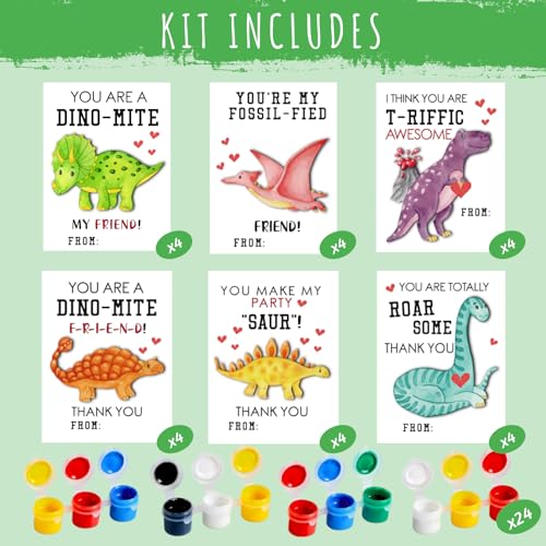 - Package Includes: The dinosaur party favors for 4-8 feature 24 dinosaur thank-you cards, 24 dinosaur wood crafts (6 unique designs), 24 3-color watercolor paints, 24 painting brushes, and 26 clear bags.