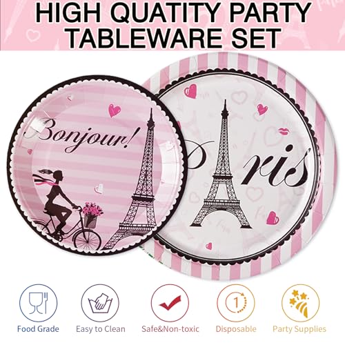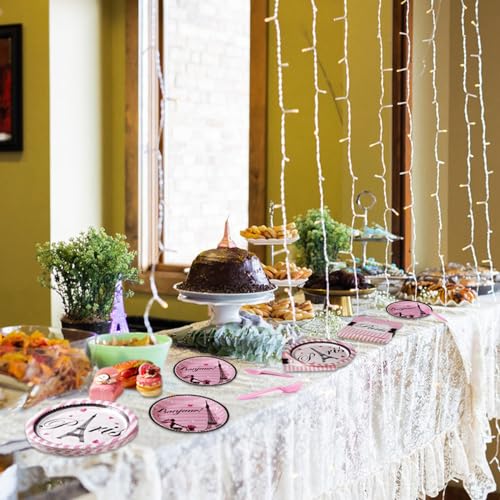- 【Beautiful Design】This light pink tableware set features a pink parisian design with the Eiffel tower framed by stripes to create a perfectly coordinated theme. Creates a perfectly coordinated theme for kids' birthdays, baby showers, brunches, picnics, and family events