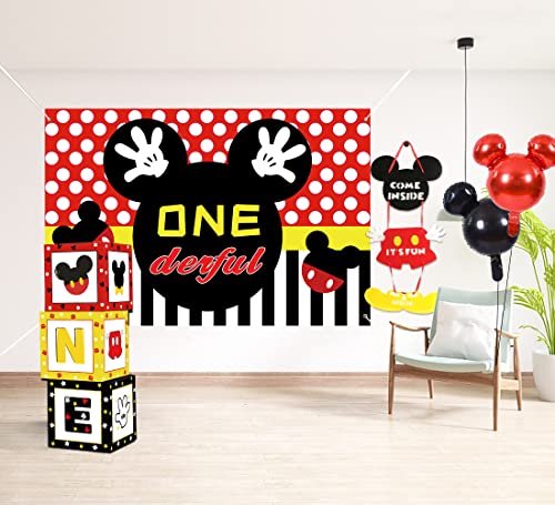 - GREPARPY Mickey 1st Birthday Party Supplies – Mickey Theme Mouse Party Decorations, Backdrop, Balloon Garland, Balloon Box, Door Hanger, Banner, Crown, Topper, Mickey First Birthday Party Decorations
