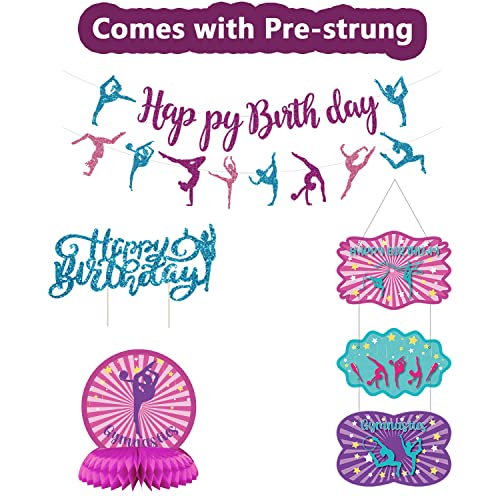- Gymnastics party decoration set includes: you will get 1 HAPPY BIRTHDAY banner, 1 gymnastics element banner, 1 hanging door decoration, 3 honeycomb centerpieces, 1 large cake decoration, 18 latex balloons (purple, pink, blue, 6pcs/color)