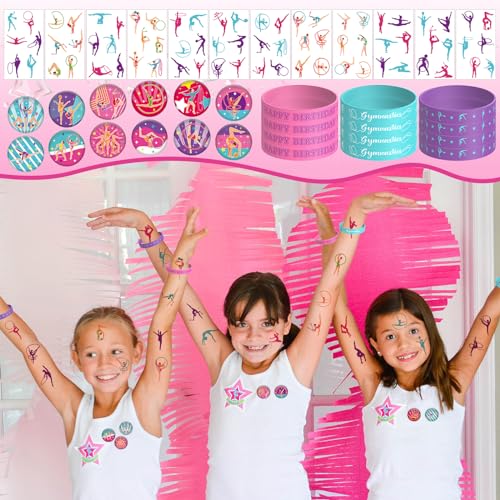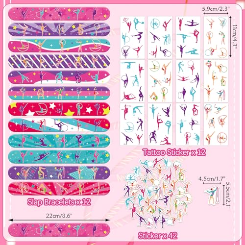 - Gymnastics Party Favors: Get Gymnastics party supplies you need for a fun-filled Gymnastics-themed party for kids, including 12 wristbands, 12 slap bracelets, 12 button pins, 12 tattoos stickers, 42 gymnastics shape stickers and 12 gift bags.