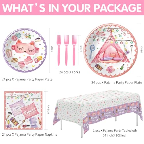 - 【What Will You Get】This pajama table decorations tableware set can accommodate up to 24 guests and includes everything you need: 24pcs 9'' pajama dinner plates, 24pcs 7'' slumber dessert plates, 24pcs napkins, 24pcs disposable forks, 1 pcs sleepover tablecloth. Get these sleepover birthday party supplies to elevate your celebration