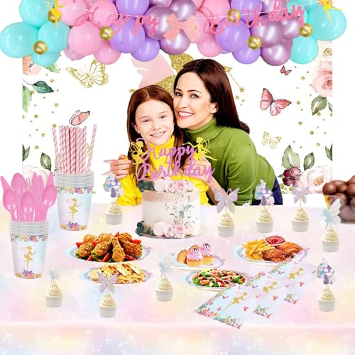 - FAIRY BIRTHDAY DECORATIONS INCLUDES – 48 x 12’’ latex balloons | 7 x 5’’ latex balloons | 1 x backdrop | 1 x glitter banner | 1 x tablecloth | 1 x cake topper | 9 x cupcake toppers | 20 x 9’’ plates | 20 x 7’’ plates | 20 x napkins | 20 x cups | 20 x straws | 20 x knives | 20 x forks | 20 x spoons | balloon strip | glue dots | ribbons