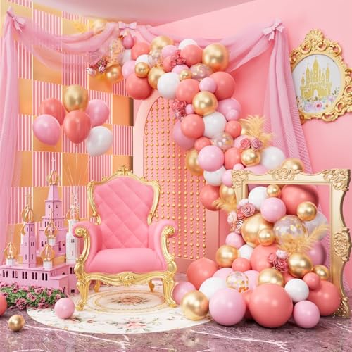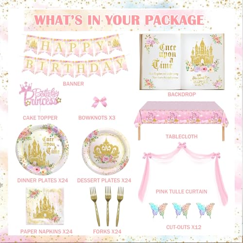 - Princess Birthday Party Decorations Includes: 85 x latex balloons, 1 x backdrop, 1 x banner, 1 x tablecloth, 1 x tulle curtain, 3 x bowknots, 1 x cake topper, 12 x cutouts, 24 x 9’’ plates, 24 x 7’’ plates, 24 x napkins, 24 x forks, balloon strip, glue dots, ribbons