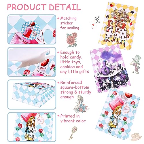 - 3 – Perfect Size for Alice in Wonderland Gifts – Each alice in wonderland treat bags is 8.27 x 6 x 3.15 inch, moderate in size, convenient for children to hold by hands. These alice in wonderland goody bags which match 6 different patterns sticker for sealing, avoid candy and little gifts falling out of alice in wonderland birthday gift bags.