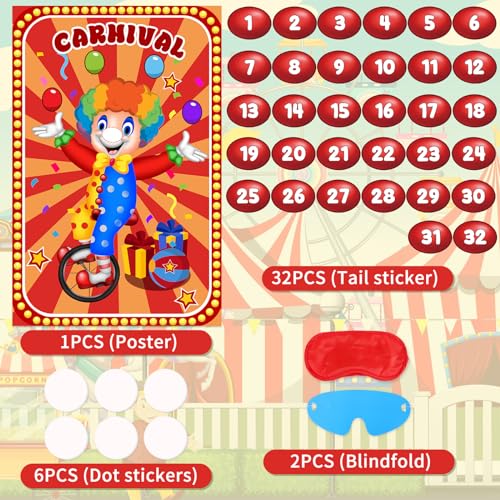 • Circus Party Games Set Includes: 1pcs 29 x 19 inch large high gloss waterproof clown poster + 1pcs red blindfold + 1pcs paper blindfold + 32pcs nose stickers + 6pcs free double-sided adhesive, which can support many people to play pin games together at parties.