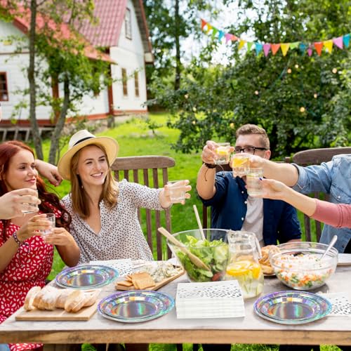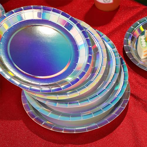 - Shimmery Iridescent Design: Our iridescent plates and napkins set features a shiny iridescent design and showcases stunning colors that create different color effects under varying lights, making it an ideal centerpiece for your party.