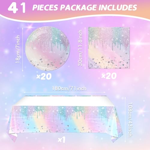 • šŸŽ‰ć€Package Include怑Iridescent diamond happy birthday party supplies including 20 x 7 inch plates, 20 napkins, and 1 tablecover(43*71inch), this complete shiny happy Birthday party decoration set can serve 20 people, to make sure you have enough utensils and decorations for a Laser birthday party