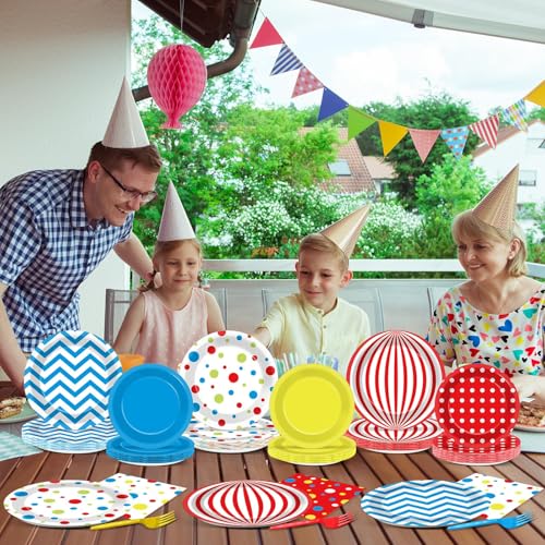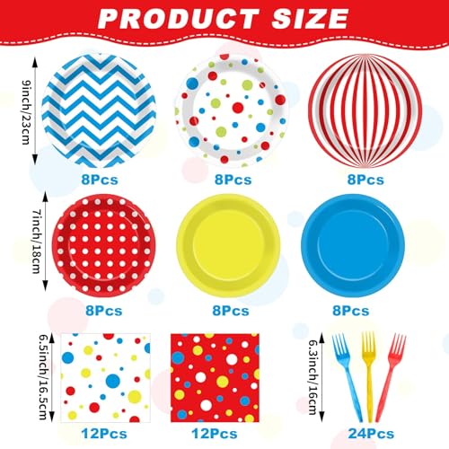 - Eye-catching circus design: Our circus party supplies will instantly elevate the atmosphere, adding a joyful touch to your decor. The circus party plates napkins set features a playful combination of bold stripes, polka dots, and arc line patterns in bright primary colors—blue, red, and yellow—that will make your party more impressive and attractive.