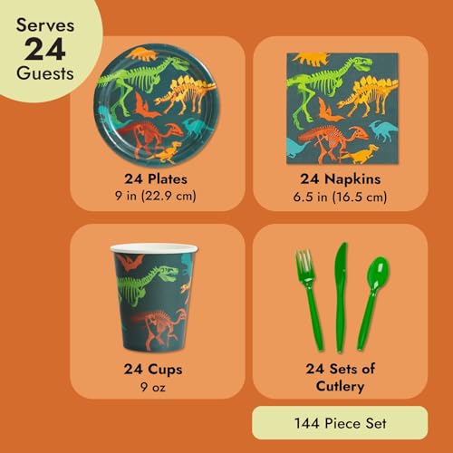 - Comprehensive Party Supplies: This complete dinosaur party plates and cups set includes 24 pieces each of plates, cups, napkins, and black plastic cutlery. With a total of 144 items, this set provides everything needed for vibrant dinosaur birthday decorations