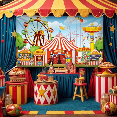 - QUALITY PRODUCT | ELEVATE YOUR EXPERIENCE : We are confident with the quality of these circus theme party decorations. This carnival photo backdrop, we are here to assist you with carnival birthday party supplies. This welcome to carnival banners is perfect for circus tent backdrop, state fair decorations, carnival theme decorations, carnival games, carnival birthday decorations, carnival birthday banner, carnival birthday backdrop, circus decorations, circus decorations, carnival banner outdoor katchon xtralarge carnival backdrop katchon extra large carnival backdrop