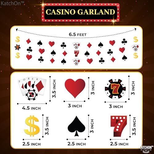 - EASY TO USE – Setting up your casino banner for casino style decorations is a breeze! With pre-punched holes for easy hanging, you can quickly display casino theme decorations wherever you need. Whether you're using string, ribbon, or hooks, this casino decorations party theme banner garland can be effortlessly secured in place, allowing you to focus on enjoying your poker theme party decorations, vegas bachelorette party decorations. Can also be used as casino bridal shower banner.