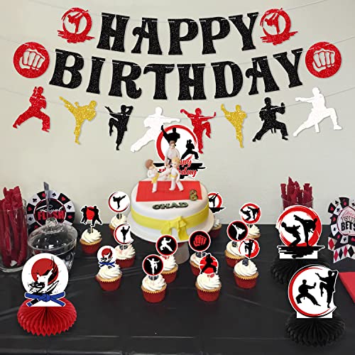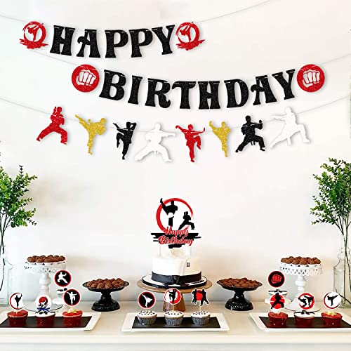 - karate party decoration set includes: 1 HAPPY BIRTHDAY banner, 1 Karate element pattern banner, 3 karate centerpieces, 1 large cake decoration, 12 cupcake decorations, and 18 Karate pattern balloons, The perfect karate party decoration set to bring more fun to your party