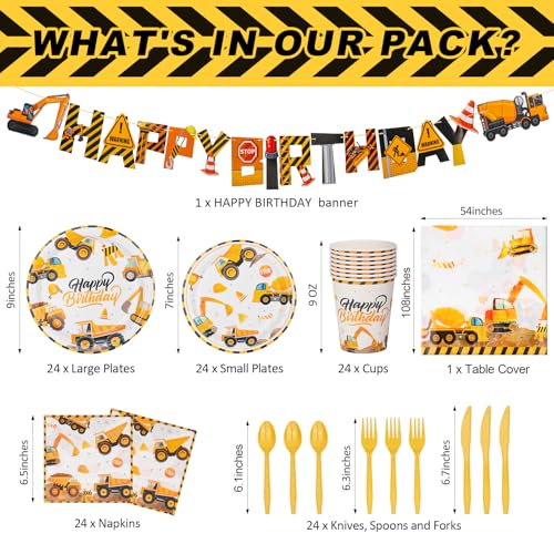 - Value Pack: The construction birthday party supplies package 170 pieces of plates and napkins sets including 24 pcs set of 7inch paper plates, 9inch paper plates, napkins, cutlery (knives, forks and spoons), paper cups and 1 pcs construction themed table cloth, 1 pcs construction birthday party banner. The quantity is sufficient to serve multiple people and create an adorable construction themed party for you