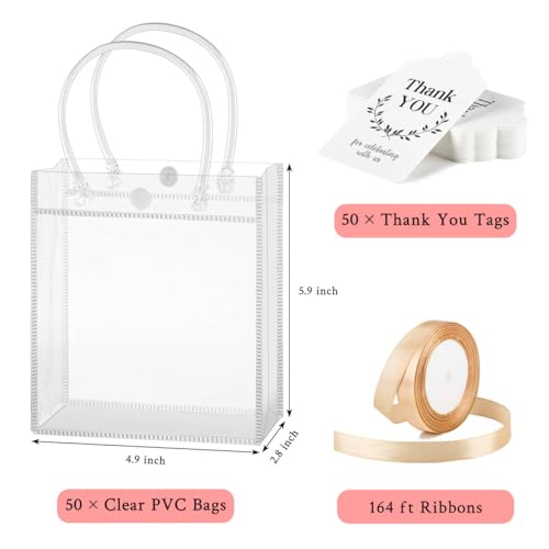 Mauproy 50 Pack Clear Plastic Gift Bags with Handles, Party Favor Bags with Ribbons and Tags, Reusable Goodie Tote Bags for Wedding Baby Shower Christmas (4.9" x 5.9" x 2.8")
