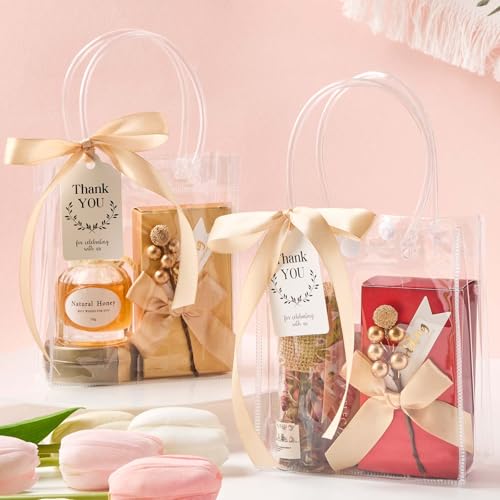 • Thoughtful Combination: You will get 50pcs clear plastic gift bags with handles, 50pcs thank you tags and 82ft Ribbons, which will make your gift outstanding and attractive