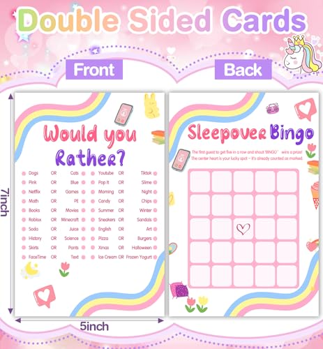 - High Quality Printing: Each sleepover games card is printed with vibrant colors and clear graphics. With fluent writing, the high – quality printing ensures that the designs are easy to read and visually appealing to all your guests these sleep over essentials for girls party. Their Sleepover Party Supplies for Girls beautiful and thematic designs enhance your , being perfect for setting a festive party atmosphere.