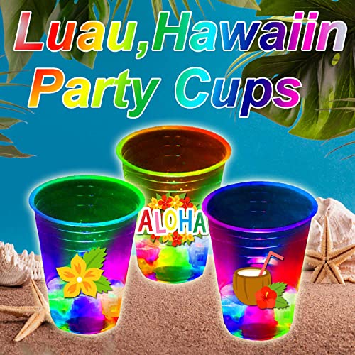 - Glow Hawaiian Luau Party Cups: Include 24 16oz Hawaiian theme cups, luau cups, tropical cups, 24 flash LED lights, 24 waterproof kit stickers.