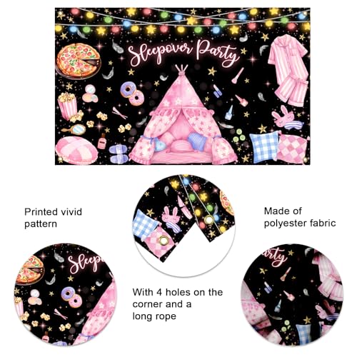 - Elegant Design: This pajama party backdrop is printed with colorful string lights and a pink tent pattern, adding pajama pillows and makeup for decoration with eye-catching "sleepover party" text, perfect for celebrating a girl's night pajama themed party