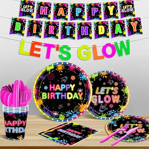Neon Birthday Party Decorations, 172Pcs Let's Glow in the Dark Birthday Party Decorations, Neon Party Supplies with Neon Balloon Arch Backdrop Tablecloth Plates Napkins for Glow Party Decorations