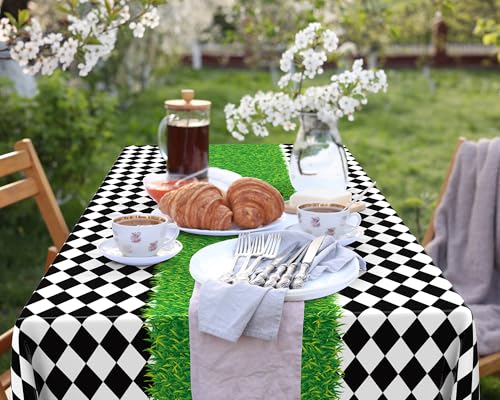 - Wonderland Theme Design: each rectangular tablecloth features whimsical elements inspired wonderland, diamond shaped checker and green grass table runner, creating a dreamy atmosphere for your dining experience; The vibrant colors and playful motifs make your table visually appealing, elevating the decor and impressing your guests