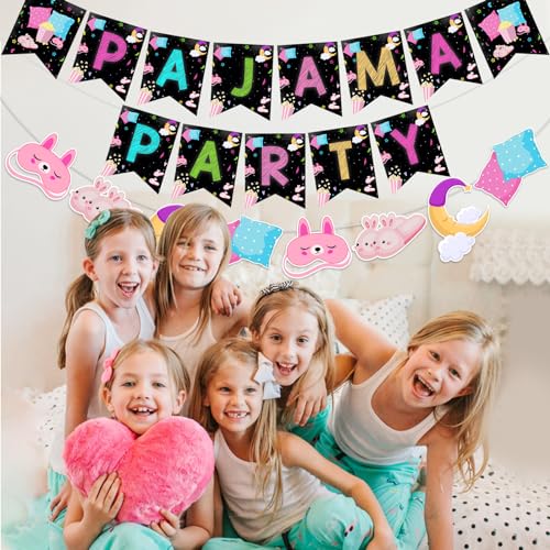 - Easy to Assemble: Our slumber party bunting garland is pre-strung, very time-saving. The neon pajama party banner needs to be assembled by yourself, just take 1 or 2 minutes string up! You just need string the strong ropes into the cardboard, it will not fall off easily even if it is hung outdoor.