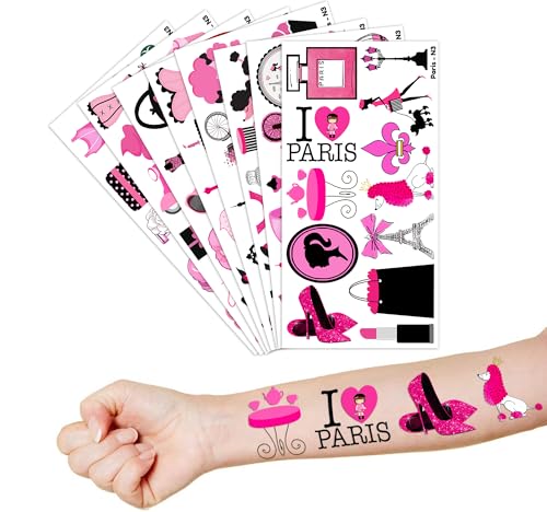 - Cute Paris French France Eiffel Towers City Landscape Party Supplies: 8 sheets Paris theme temporary tattoos stickers, features an assortment of cute themed characters, each pattern measures 6.1 x 3.1 inch , all kinds of designs and colors will bring more fun to your party, one size fit all adult and kids.