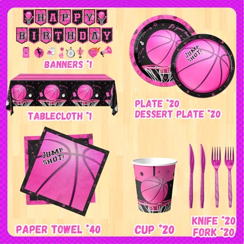 - 【Basketball Birthday Party Decorations】You will receive 142pcs pink basketball party decorations includes: 1pc happy birthday banner, 1pc basketball tablecloth, 40pcs basketball plates (2 sizes), 20pcs cups, 40pcs basketball napkins, 20 knives and forks, our basketball theme party decorations will bring you a joyful atmosphere.