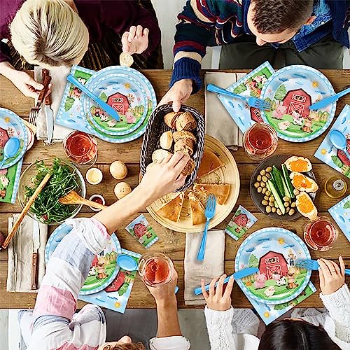 - Barnyard Animals Party Tableware: This Farm House theme birthday tableware set includes 24pcs 9'' dinner paper plates, 24pcs 7'' dessert paper plates, 24pcs napkins, 24pcs cups, 24pcs forks, 24pcs spoons, 24pcs knifees, for Barnyard Animals birthday party supplies