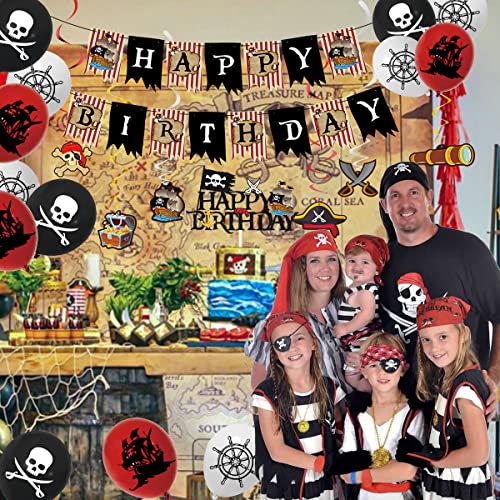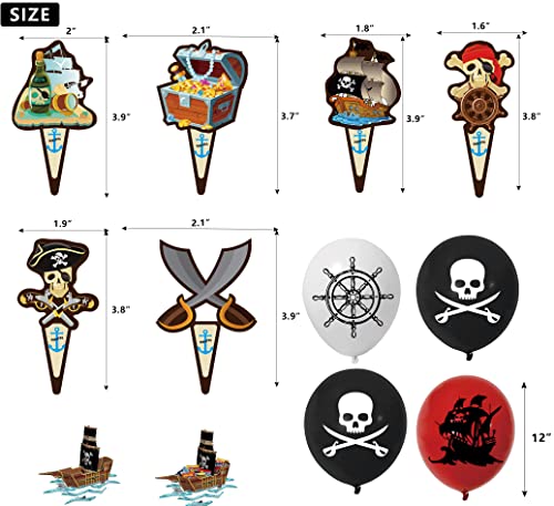 - PIRATE THEMED PARTY DECORATIONS: Our 50 pieces pirate decorations include: 1 happy birthday pirate themed banner, 6 hanging swirls(streamers), 1 happy birthday sign cake topper, 24 pirate cupcake toppers and 18 pirate birthday balloons, designed with pirate elements
