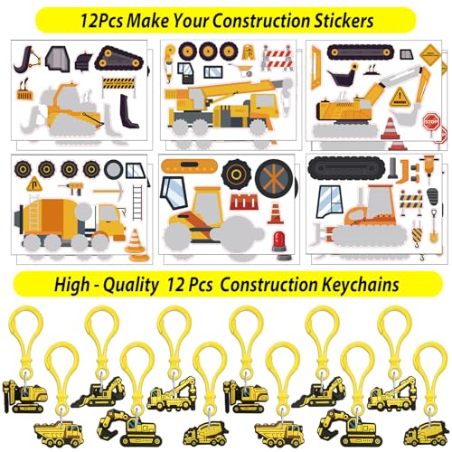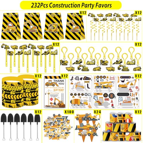 - Construction Birthday Party Supplies: 232pcs party favors featuring everything you need to make your party a hit. This set includes 12 Construction treat bags,12 Construction straws,12 Wristbands,12 Keychains,12 Construction bubble wands with construction charms,12 Make-a-face stickers,12 Slap bracelets,12 Thank You cards,12 Shovels,24 Cake toppers,100 Vehicle stickers. These construction party favor bag fillers are perfect party favors gift fillers or pinata fillers