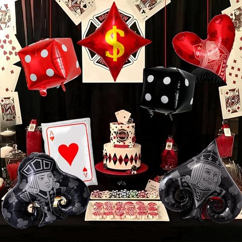 - ♥️Set includes: Playing Card Balloon Set includes 1 Red Heart Balloon(Single sided pattern), 1 Spade Balloon(Single sided pattern), 1 Square Balloon(Single sided pattern), 1 Plum Blossom Balloon(Single sided pattern),1 red dice(Six sided pattern),1 black dice(Six sided pattern), and 1 Square Red Heart Balloon(Double sided pattern) to meet your decoration needs. They are essential items for hosting casino parties, allowing you to experience a rich casino party atmosphere as soon as you enter the venue.