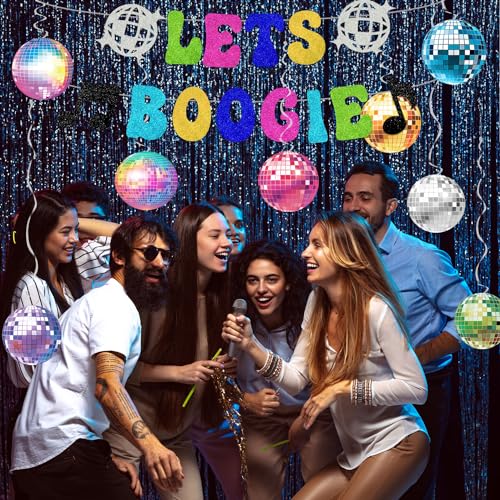 - Retro Disco Party Decoration Set: This vibrant disco-themed set includes a glittering "LETS BOOGIE" banner and 8 disco-themed hanging swirls with printed disco ball designs, perfect for enhancing your 70s disco party or retro-themed event.