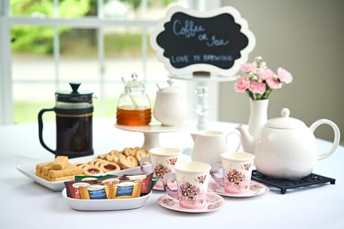 - Set of 24 Pink Tea Party Supplies – Elegantly host up to 24 friends & and guests with this beautiful tea party decor by Royal Bluebonnet. The set includes 24 disposable tea cups with handles and saucers. Plenty for your princess tea party, bridal shower tea party, floral baby shower, and your tea for two birthday party decorations.