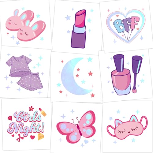 - Package Includes: 210 pieces of pink girls slumber party tattoos, 6 sheets pre-cut into small squares; each square size 1.3 x 1.3 inches , a party must have accessory or decoration for your girls sleepover party