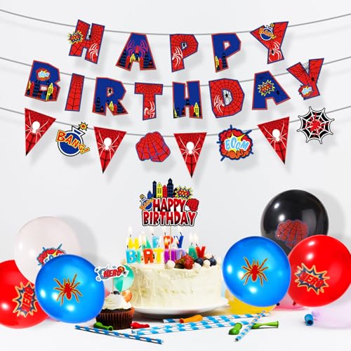 - Package Contents: You will receive a pack of spider themed party decorations, including: 20 spider themed latex balloons in 4 styles, 1 spider happy birthday banner, 8 spider themed pennant flags, 12 small cake toppers, 1 large cake topper and 6 spider themed hanging swirls to meet your decoration needs.