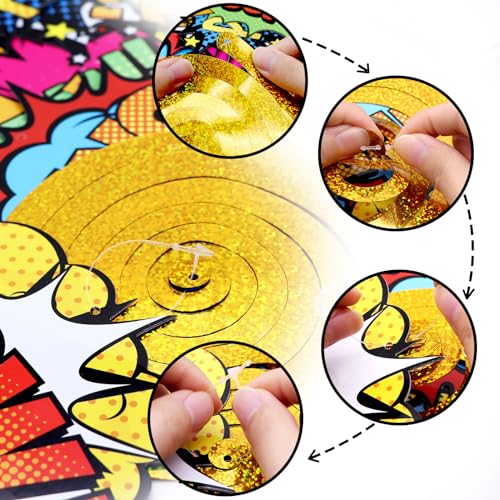 - WELL MADE — All the boom hanging swirl banner decorations are made of premium paper cards. The biggest difference between those decorations is our cutouts a printed in double side and using the bright glitter foil swirl. A real hanging decor for hero theme party.