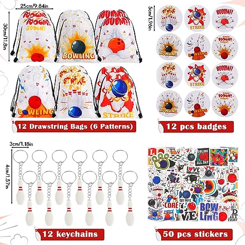 - 140 Pcs Bowling Party Supplies: the package includes 12 bowling ball pens, 18 mini bowling notepads, 12 pencils, 12 silicone bowling bracelets, 12 bowling badges, 12 bowling drawstring bags, 12 bowling keychains, and 50 bowling stickers, rich quantity to meet your bowling party use needs